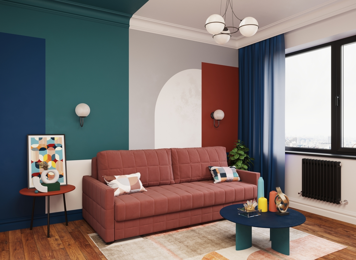 Синка, выполненная в обивочной ткани, позволяет ставить диван в центре комнаты и зонировать пространство.