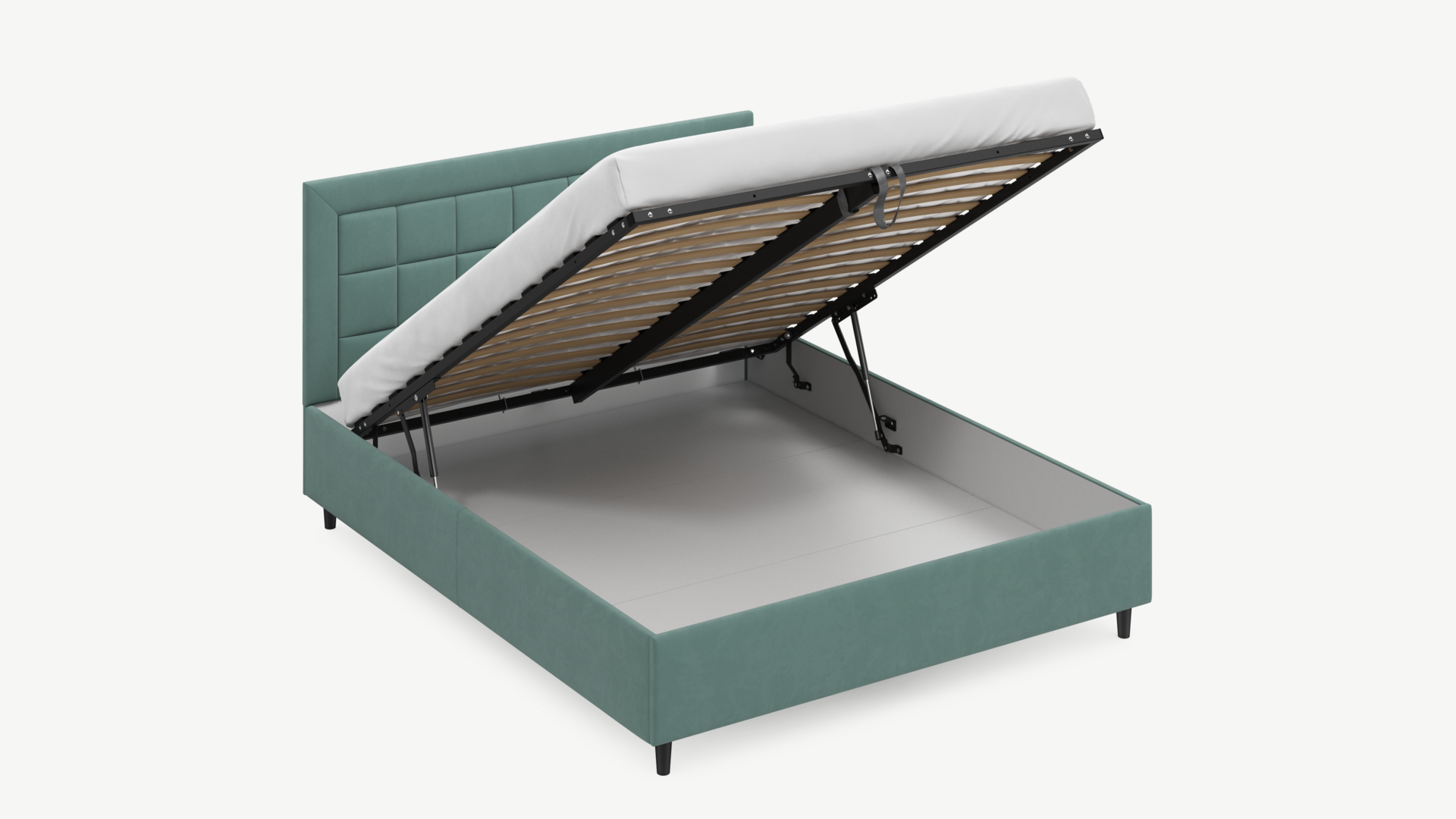 Вместительная емкость под кроватью без внутренних перегородок позволяет использовать для хранения вещей 100% пространства.
