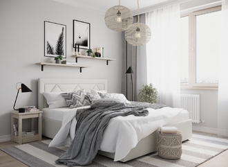 Создать гармоничный интерьер и завершить образ спальни помогут дополнительные аксессуары, например: тумбы, банкетки, подушки.