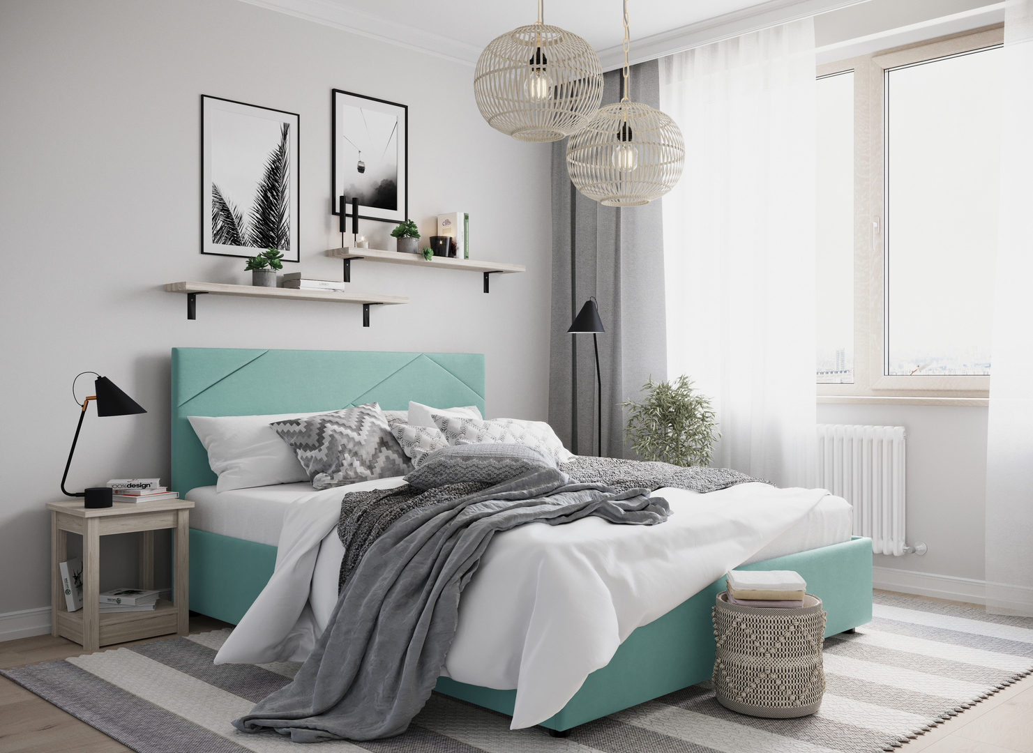 Создать гармоничный интерьер и завершить образ спальни помогут дополнительные аксессуары, например: тумбы, банкетки, подушки.