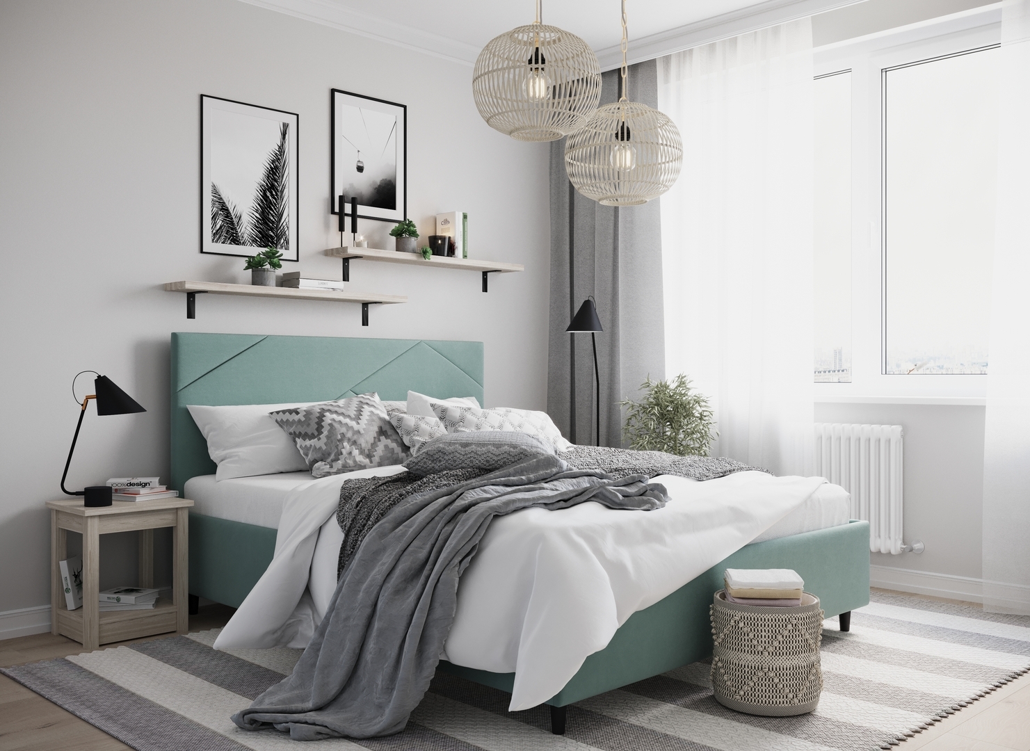 Создать гармоничный интерьер и завершить образ спальни помогут дополнительные аксессуары, например: тумбы, банкетки, подушки.