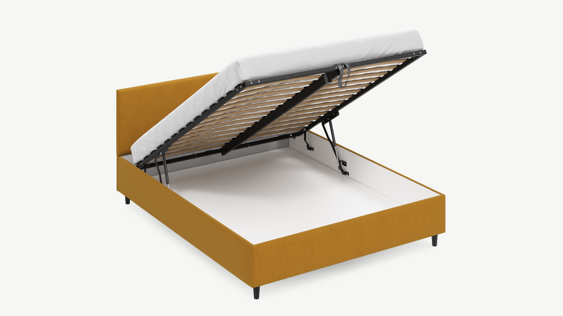• Скрытая под основанием вместительная емкость без внутренних перегородок позволяет использовать всю площадь подкроватного пространства для хранения вещей.