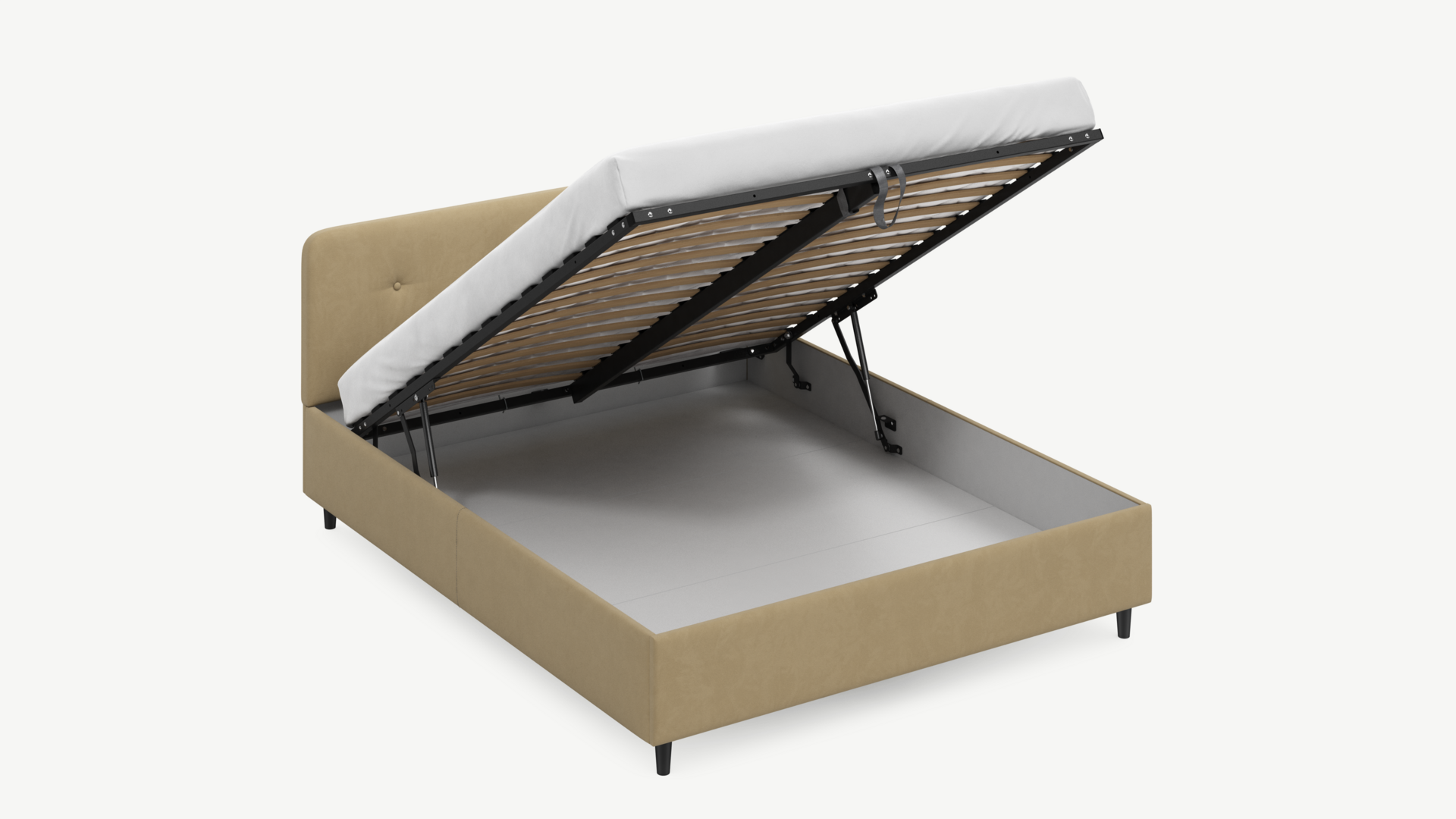 • Скрытая под основанием вместительная емкость без внутренних перегородок позволяет использовать всю площадь подкроватного пространства для хранения вещей.