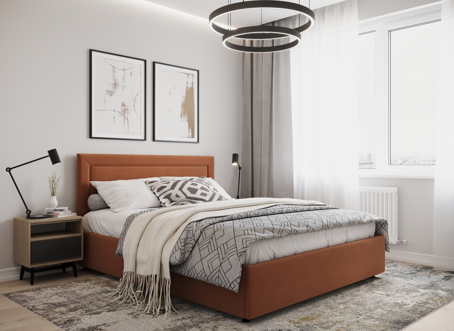 Создать гармоничный интерьер и завершить образ спальни помогут дополнительные аксессуары, например: тумбы, банкетки, подушки.