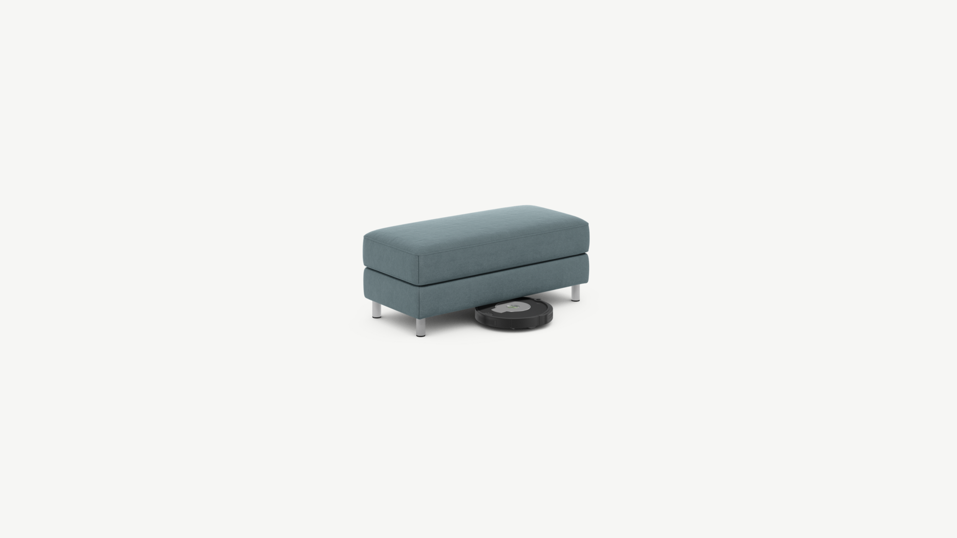 Под банкеткой с высокими цилиндрическими опорами проходит робот-пылесос.