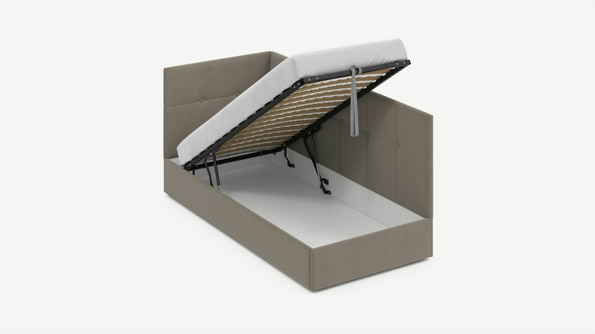 • Скрытая под основанием вместительная емкость без внутренних перегородок позволяет использовать всю площадь подкроватного пространства для хранения вещей.