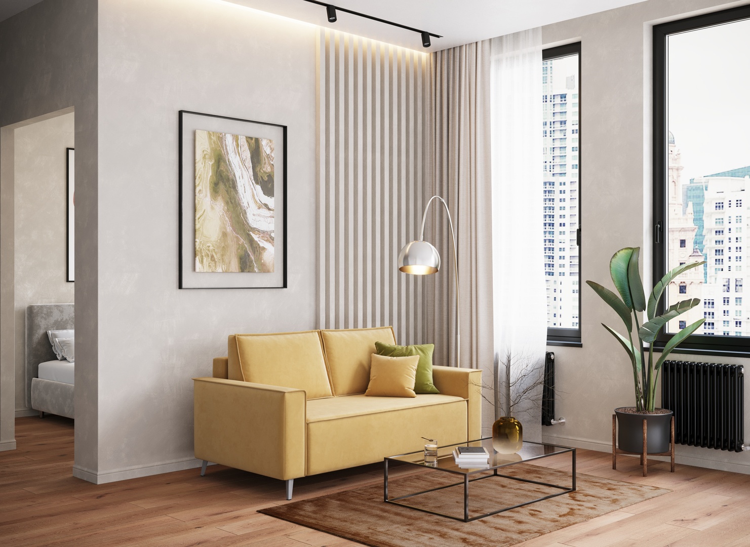 Спинка, выполненная в обивочной ткани, позволяет ставить диван в центре комнаты и зонировать пространство.
