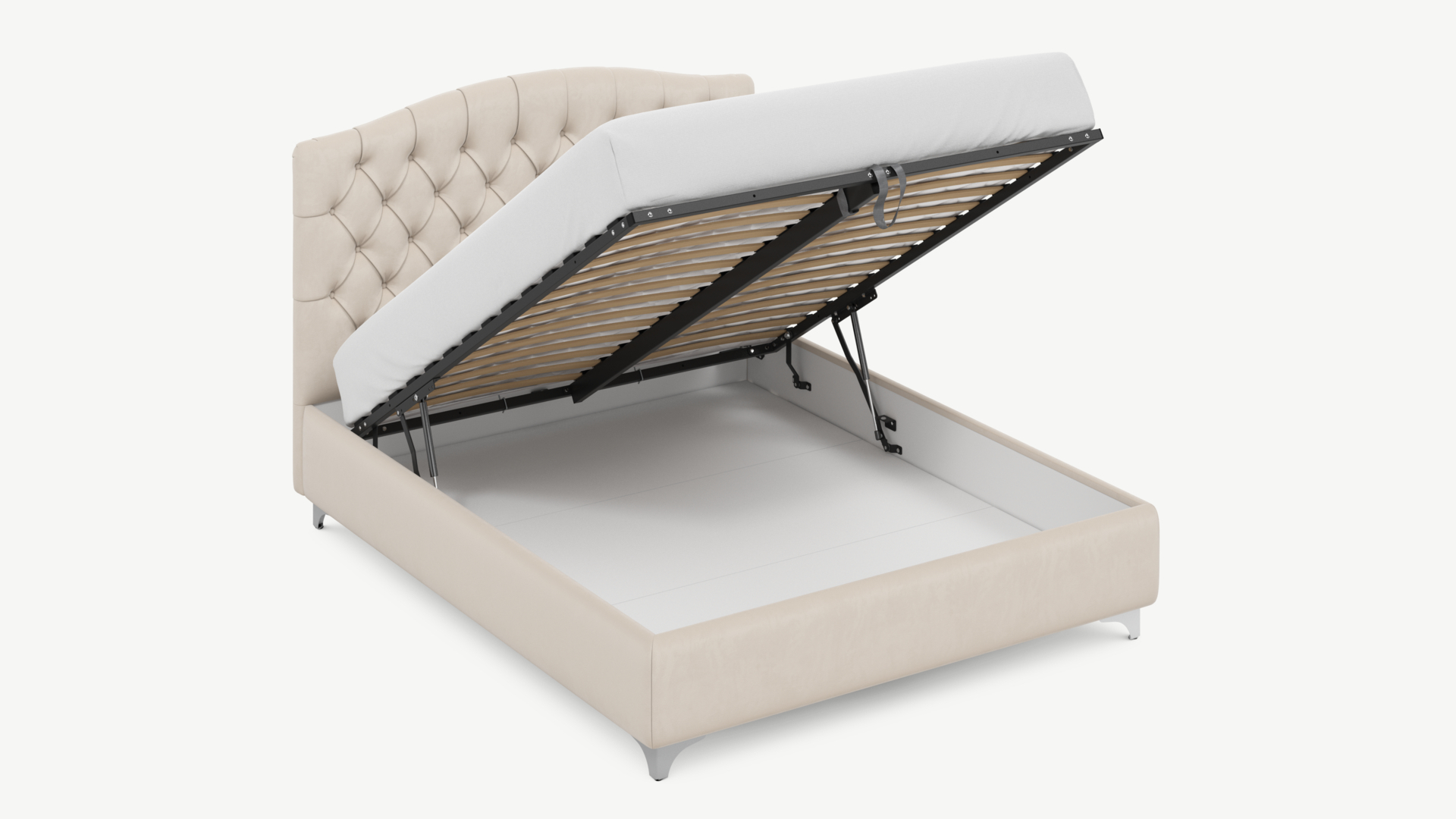 • Скрытая под основанием вместительная емкость без внутренних перегородок позволяет использовать всю площадь подкроватного пространства для хранения вещей.